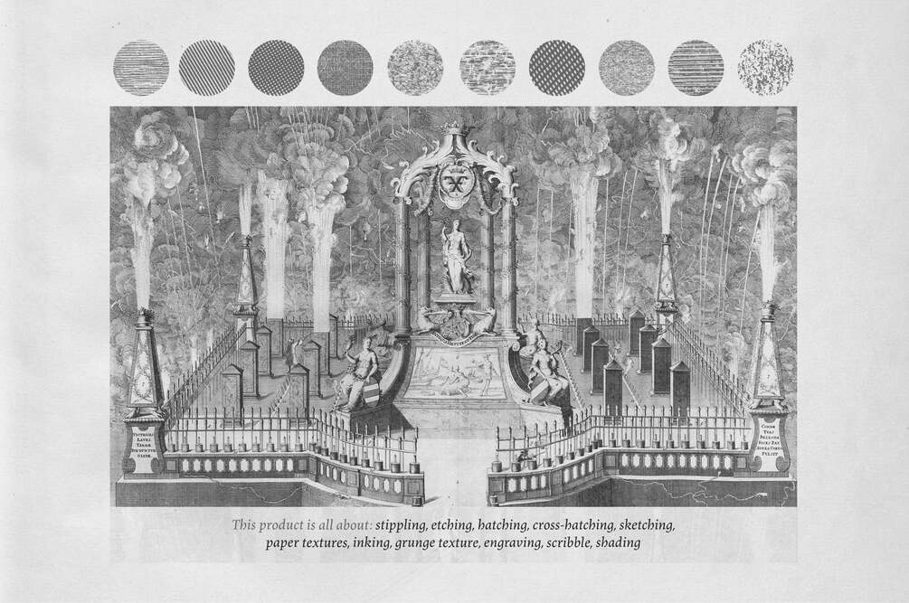 This product is all about: etching, hatching, cross-hatching, sketching, old paper texture, inking, grunge texture, grain, engraving, shading, print, dotting