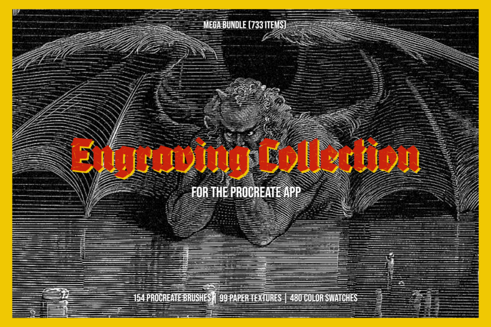 The Engraving Collection (2023) Mega Bundle (Procreate Brushes, Color Palettes & Paper Textures)