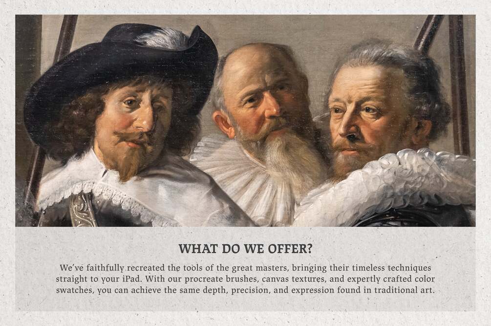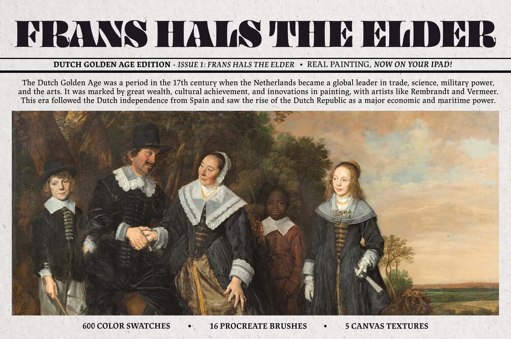 The first product in the series is dedicated to Frans Hals, a dynamic portraitist whose energetic brushwork and expressive character studies defined the era. His bold style and painterly technique have shaped the creation of these digital tools, giving you the freedom to explore the spirit of 17th-century Dutch painting right from your iPad.
