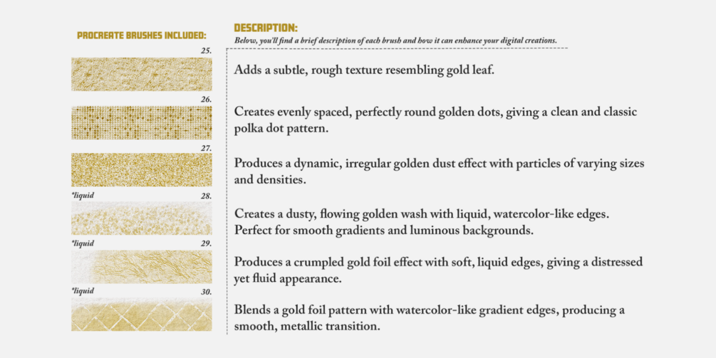 Offering thirty procreate brushes, ninety color swatches and one paper texture, we bring you a versatile toolkit designed to elevate your digital creations with golden and glitter-inspired textures.