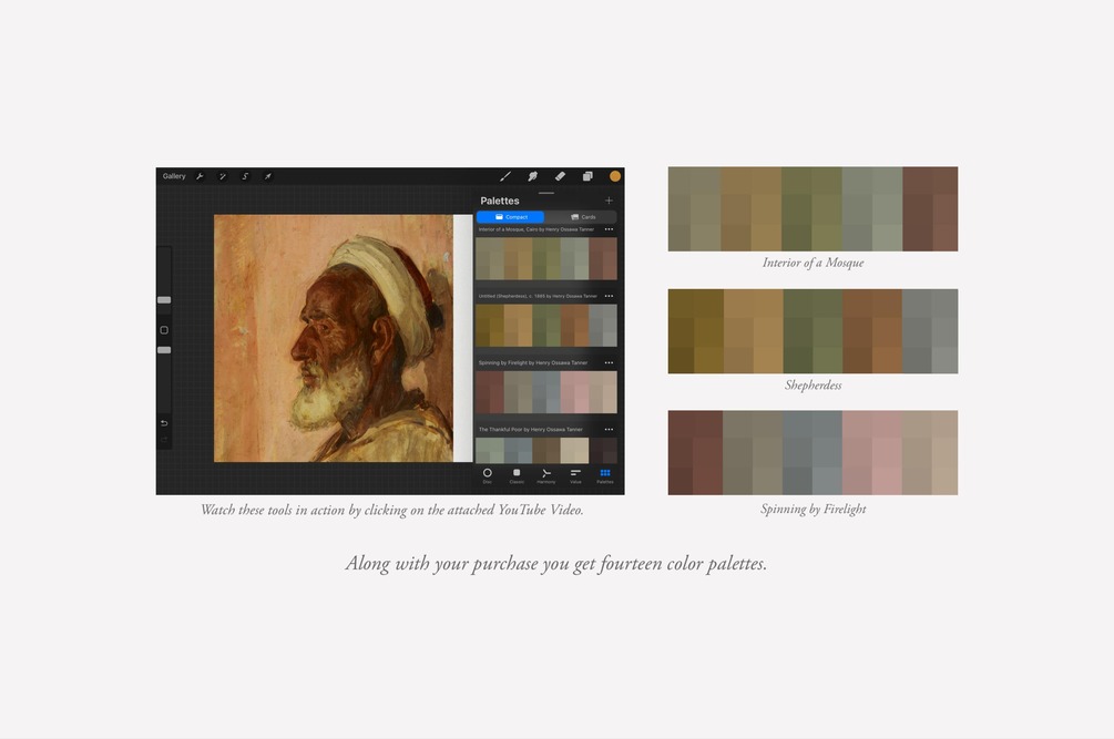 Watch the Henry Ossawa Tanner Procreate Brushes & Color Swatches in action on the attached YouTube Video.