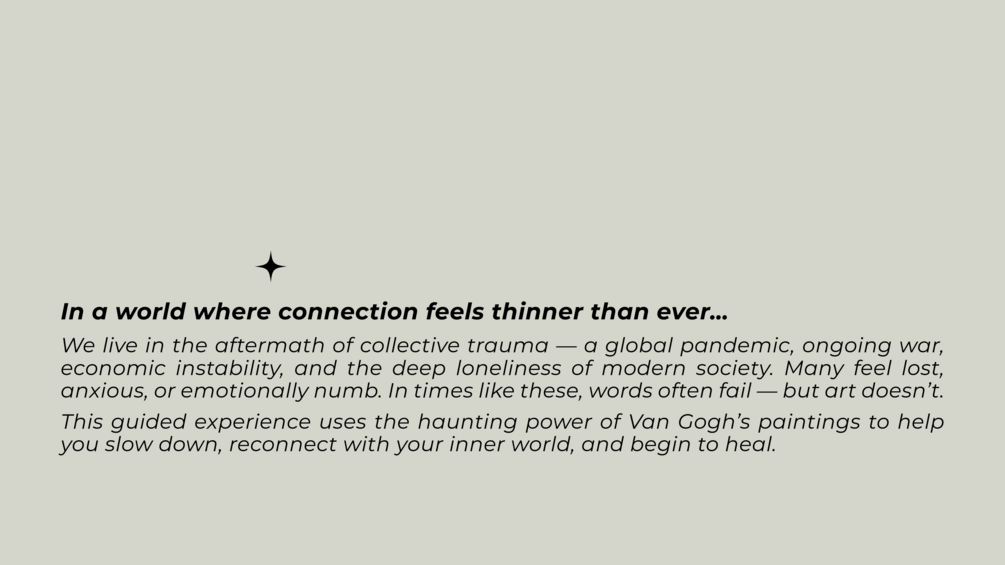 This guided reflection experience uses the haunting, quiet power of Van Gogh’s paintings to help you slow down, reconnect with your inner world, and begin to heal.