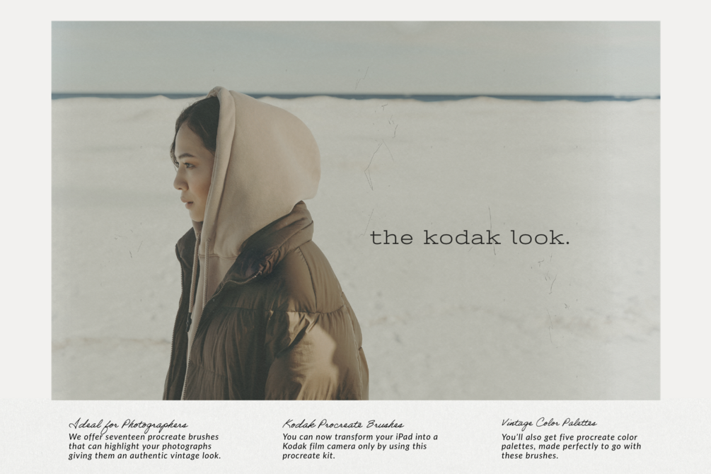 Kodak Look Procreate Brushes and Color Swatches are specially designed for Photo Editors, Illustrators, Collage Editors and Graphic Designers. You can now achieve the exact vintage look you're looking for your photography style only by using the Procreate App.