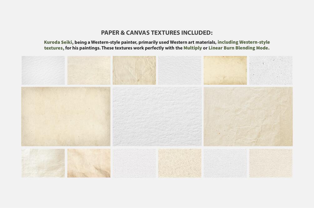 15 Paper & Canvas Textures (.PNG files) inspired by the original textures Kuroda Seiki used.