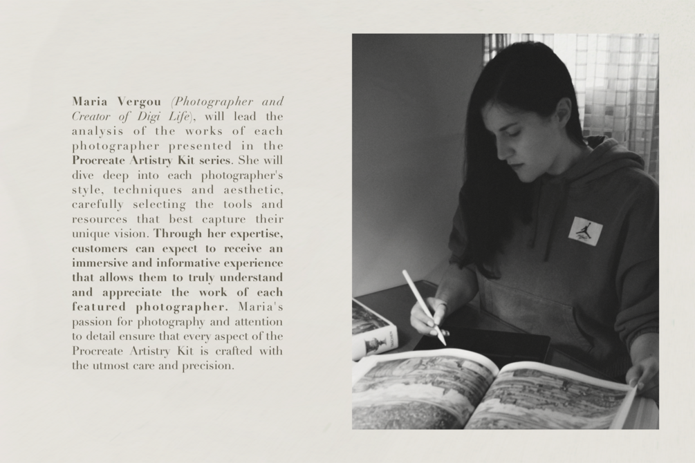 Maria Vergou (Photographer and creator of Digi Life) will lead the analysis of each photographer presented in the Procreate Artistry Kit series. She will dive deep into each photographer's style, techniques and aesthetic, carefully selecting the tools and resources that best capture their unique vision. Through her expertise, customers can expect to receive an immersive and informative experience that allows them to truly understand and appreciate the work of each featured photographer. Maria's passion for photography and attention to detail ensure that every aspect of the Procreate Artistry Kit is crafted with the utmost care and precision.