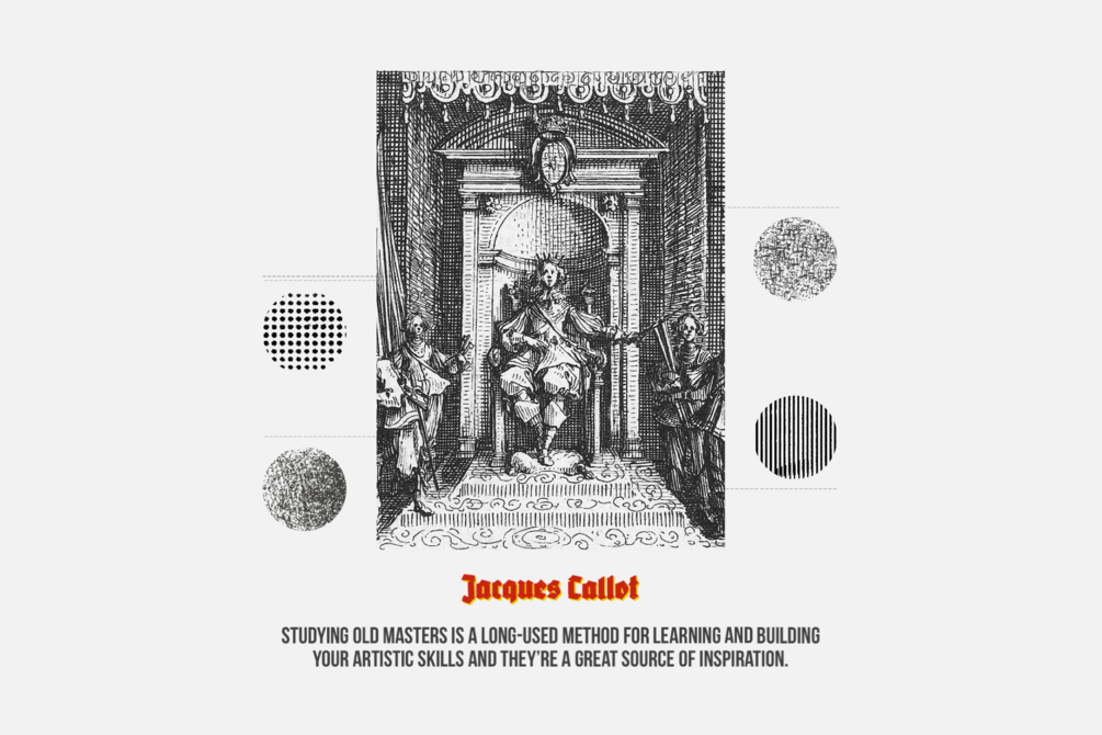 This product is inspired by Jacques Callot's engravings. "The Great Miseries of War" series was published in 1633, is Callot's best-known work, and has been called the first "anti-war statement" in European art. The images are panoramic views with many small figures, and they feature gradation from light to dark that was typical of Callot's etchings. In sequence, the images recount the story of soldiers as they enroll in an army, fight in a battle, and rampage through the civilian community, only to then be arrested and executed. The etchings can also be considered as an early prototypical French comic strip, within the text comics genre, since the illustrations are accompanied by a descriptive text beneath the images.