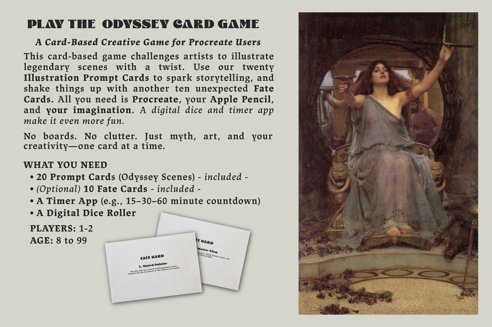 Offering 16 Procreate Brushes, 390 Color Swatches, 5 Paper Textures and 30 Printable Illustration Prompts part of The Odyssey Card Game we bring you the aesthetic of these remarkable illustrations into your iPad.