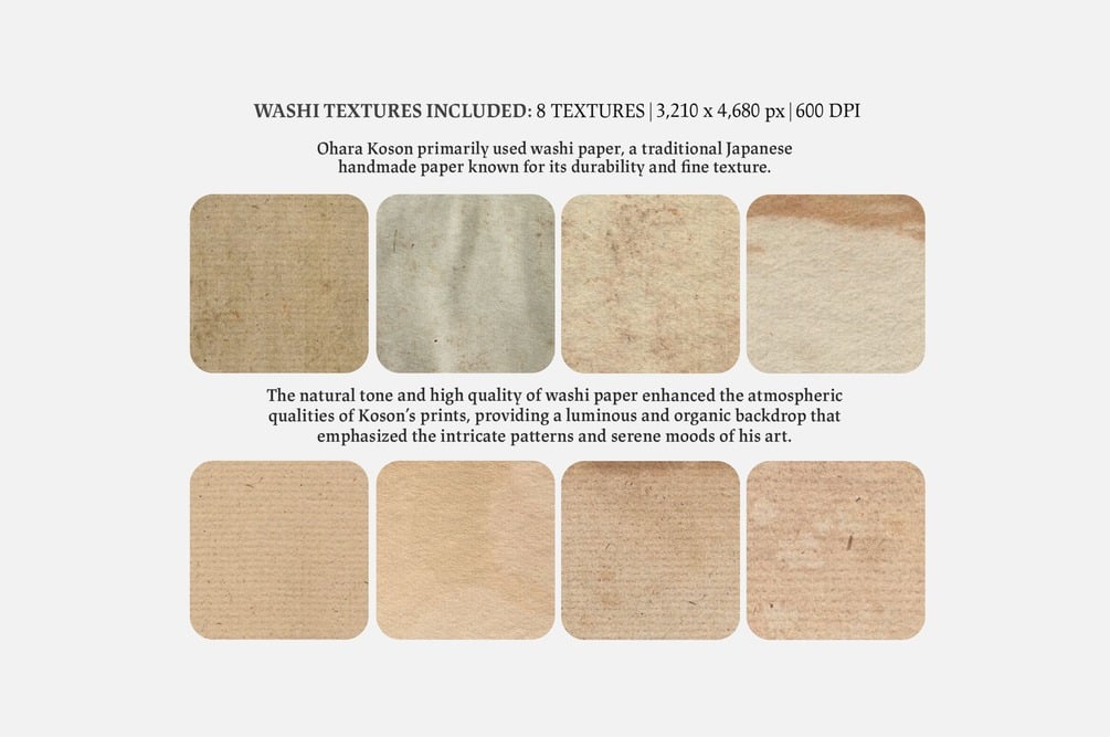 • 8 Washi Textures (.PNG files) inspired by the original textures Ohara Koson used.