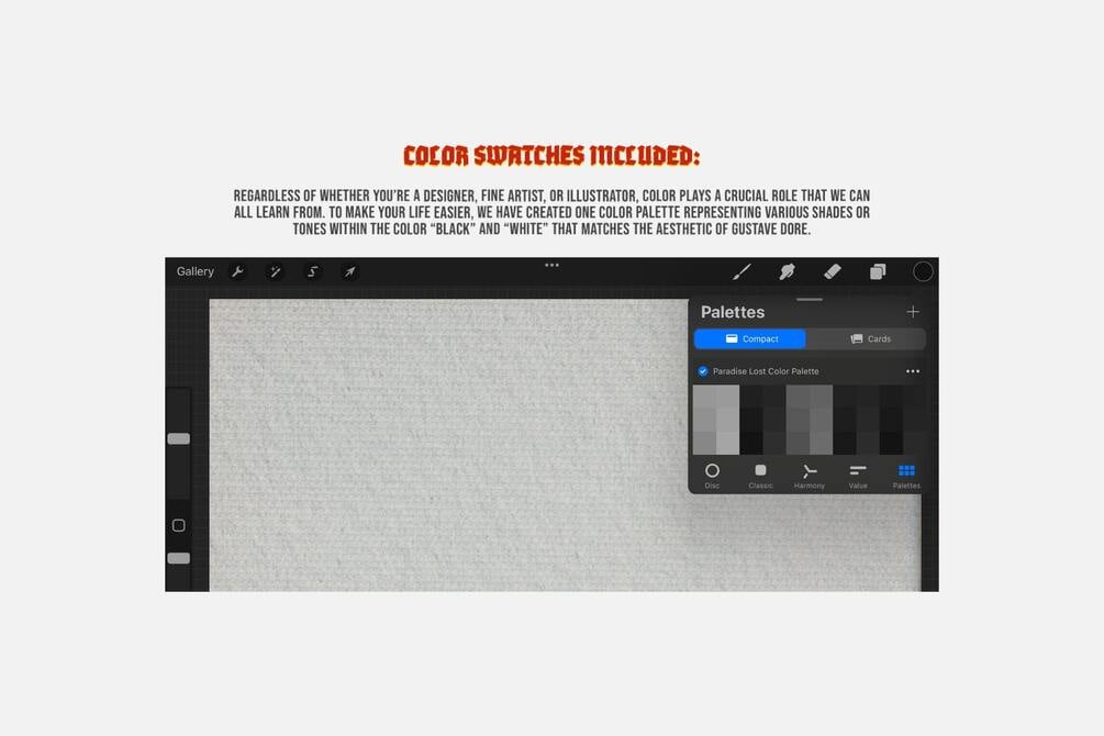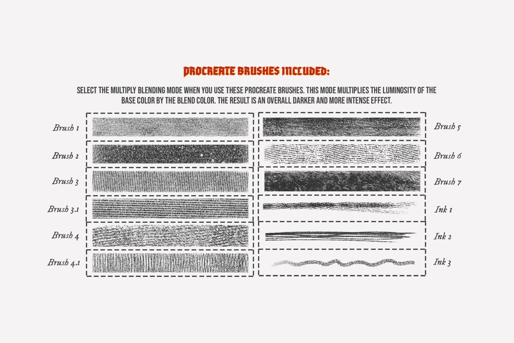Offering twelve procreate brushes, thirty color swatches and twelve paper textures we bring you the aesthetic of these remarkable illustrations into your iPad.
