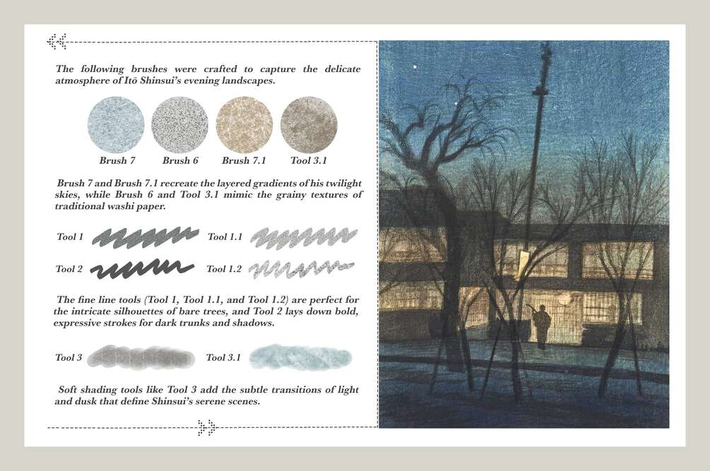 The second product in the series is dedicated to Ito Shinsui, a remarkable artist whose work captures the elegance and subtle beauty of early 20th-century Japan. His refined portraits, graceful compositions, and exquisite sense of color have inspired the creation of these digital tools, allowing you to explore his timeless style directly on your iPad.