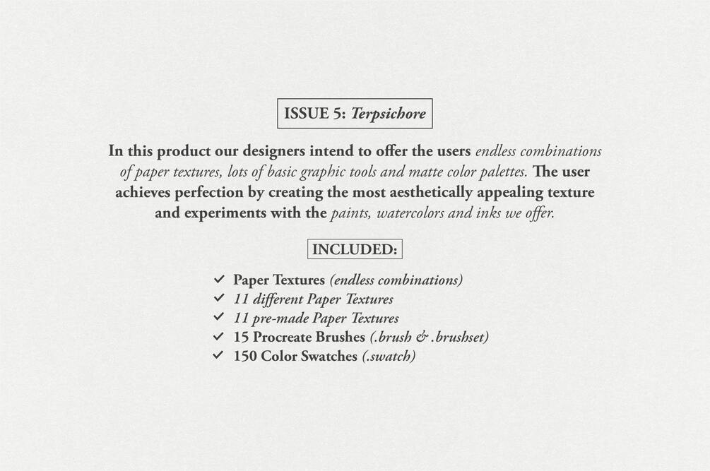 Terpsichore Procreate Brushes, Color Swatches and Paper Textures