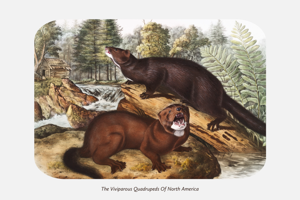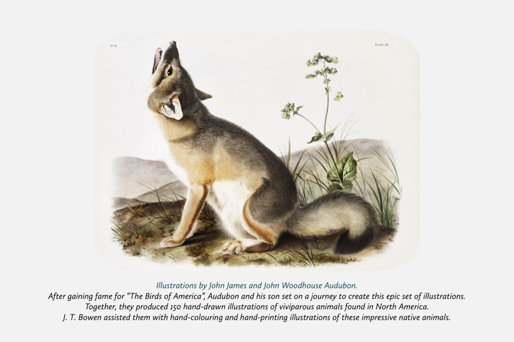 In the early 1840’s John James Audubon began working on The Viviparous Quadrupeds Of North America with the help of his son John Woodhouse Audubon. They would produce 150 folio drawings, measuring approximately 22x28 inches, hand-printed and hand colored by J.T. Bowen of Philadelphia. Each print is dated with many later plates being credited to John Woodhouse Audubon as his father’s health declined. The prints are dated 1845 – 1848.